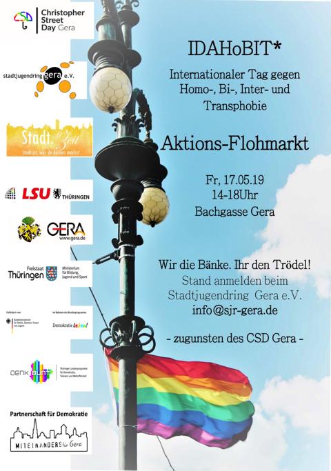 Der Stadtjugendring Gera lädt am Freitag, 17. Mai 2019 von 14 bis 18Uhr zum Aktions-Flohmarkt anlässlich des IDAHoBIT (Internationaler Tag gegen Homo-, Bi-, Inter- und Transphobie) auf die Bachgasse in Gera ein. Wir stellen die Tische – ihr den Trödel.