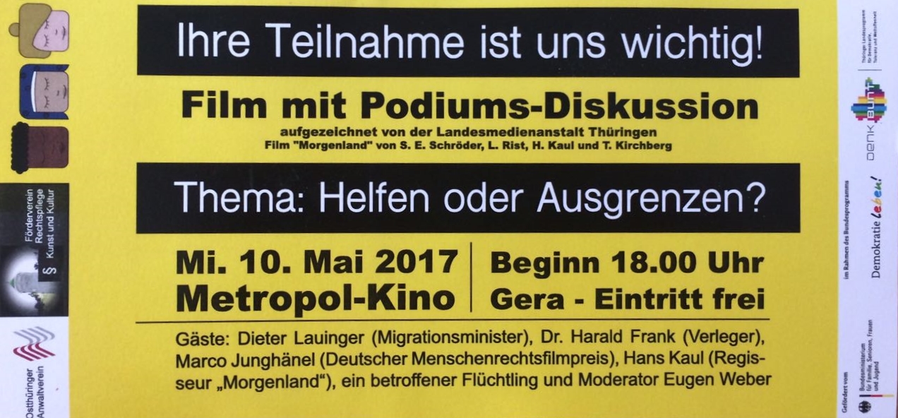 Wie man unschwer erkennen kann, geht es bei dieser Filmpodiumsreihe um das derzeit wohl aktuellste weltpolitische Thema, die MENSCHENRECHTE. In den Mittelpunkt dieser Auftaktveranstaltung haben wir die uns alle beschäftigende und von unseren Bürgern unterschiedlich beantwortete Flüchtlingsfrage „HELFEN oder AUSGRENZEN?“ gestellt. Eingeleitet wird die Podiumsdiskussion mit dem Film „Morgenland“ (Preisträger der Kategorie ‚Amateure‘ beim Deutschen Menschenrechts-Filmpreis 2016). Podiumsgäste sind u.a. der Thüringer Migrationsminister Dieter Lauinger und der Geraer Verleger Dr. Harald Frank. Im Anschluss an die Podiumsdiskussion kann man sich in dem wunderschönen Foyer des Kinos in gemütlicher Runde bei einem kleinen Imbiss über das Gesagte oder noch nicht Gesagte austauschen.