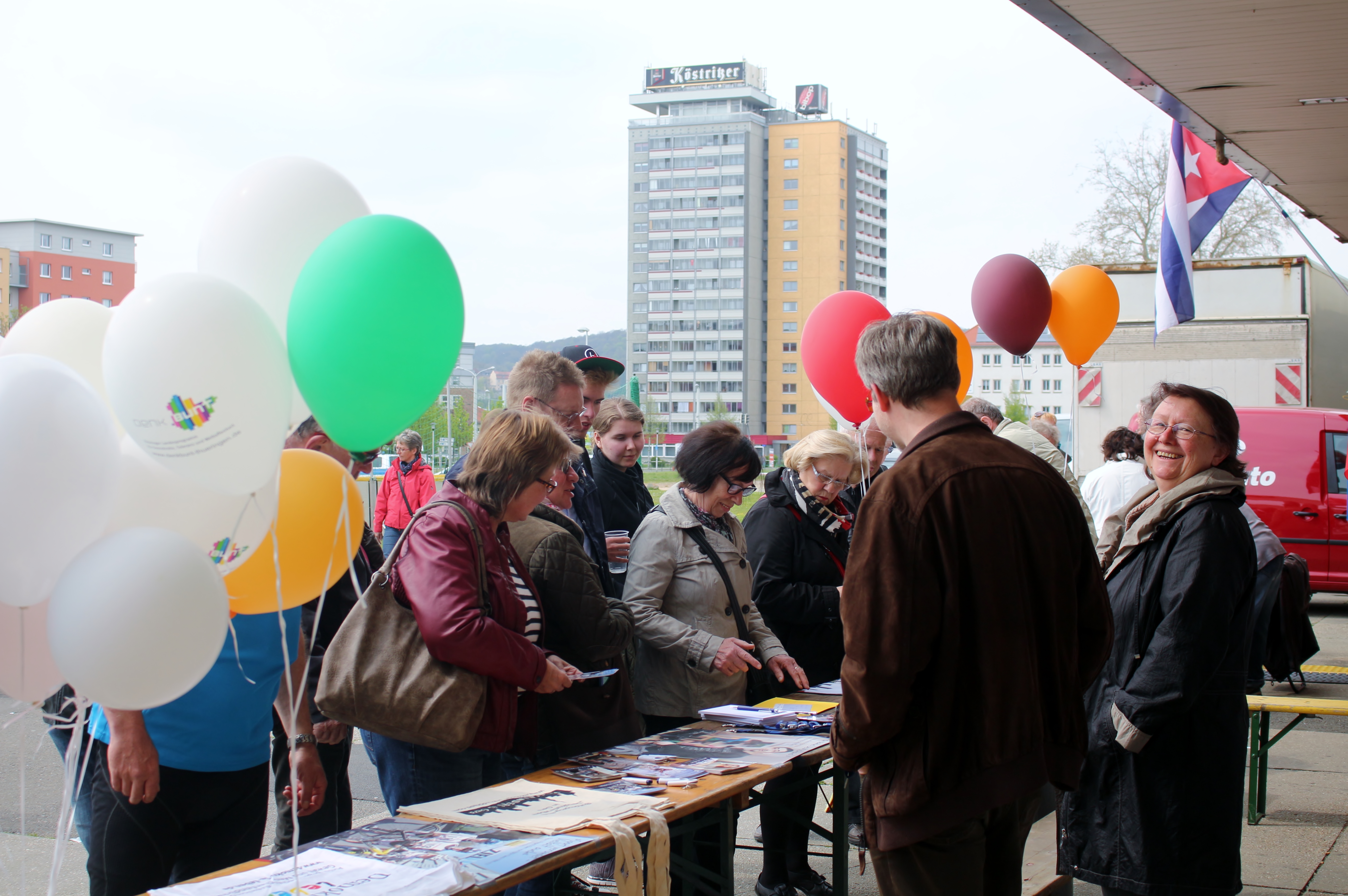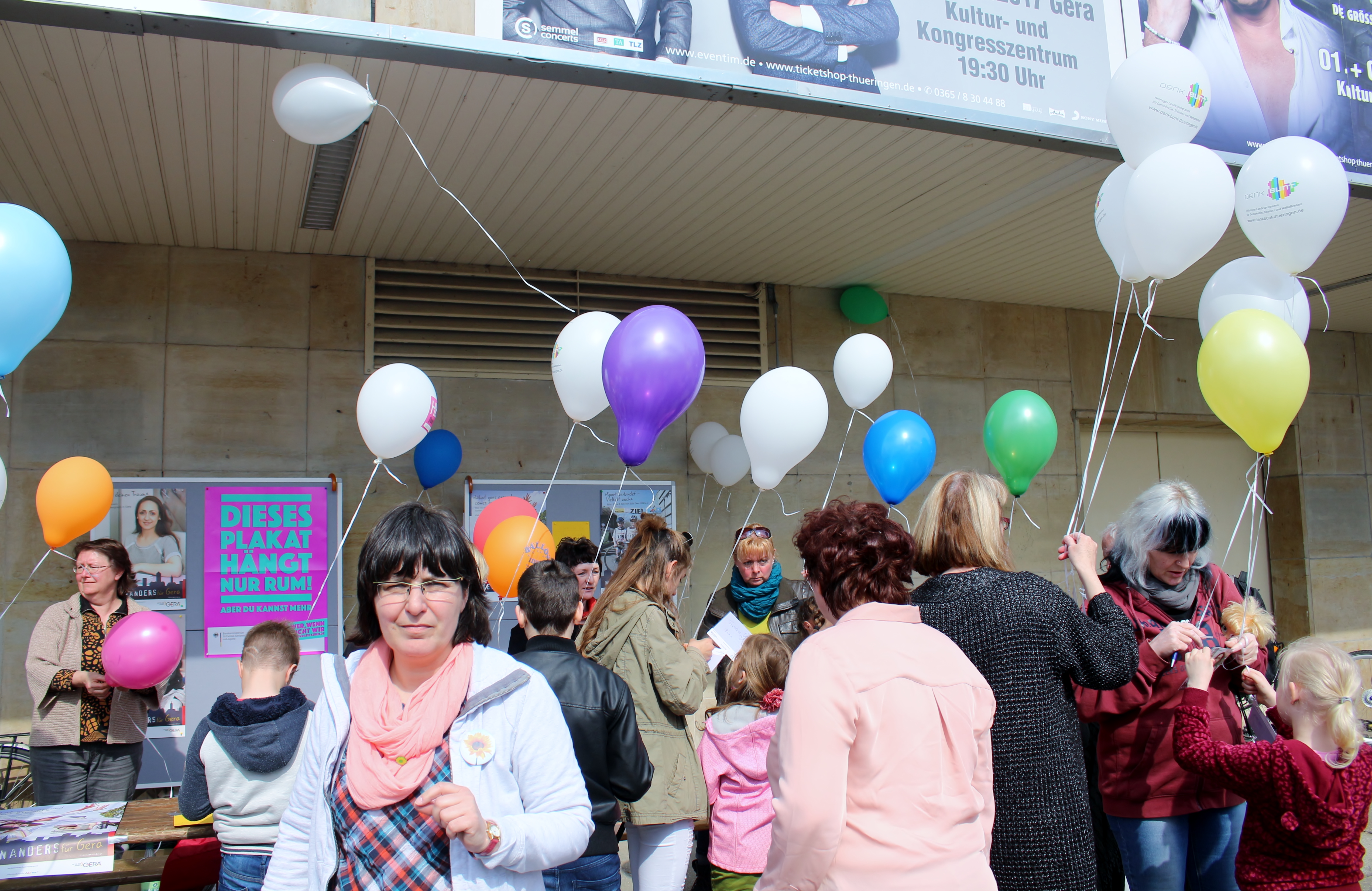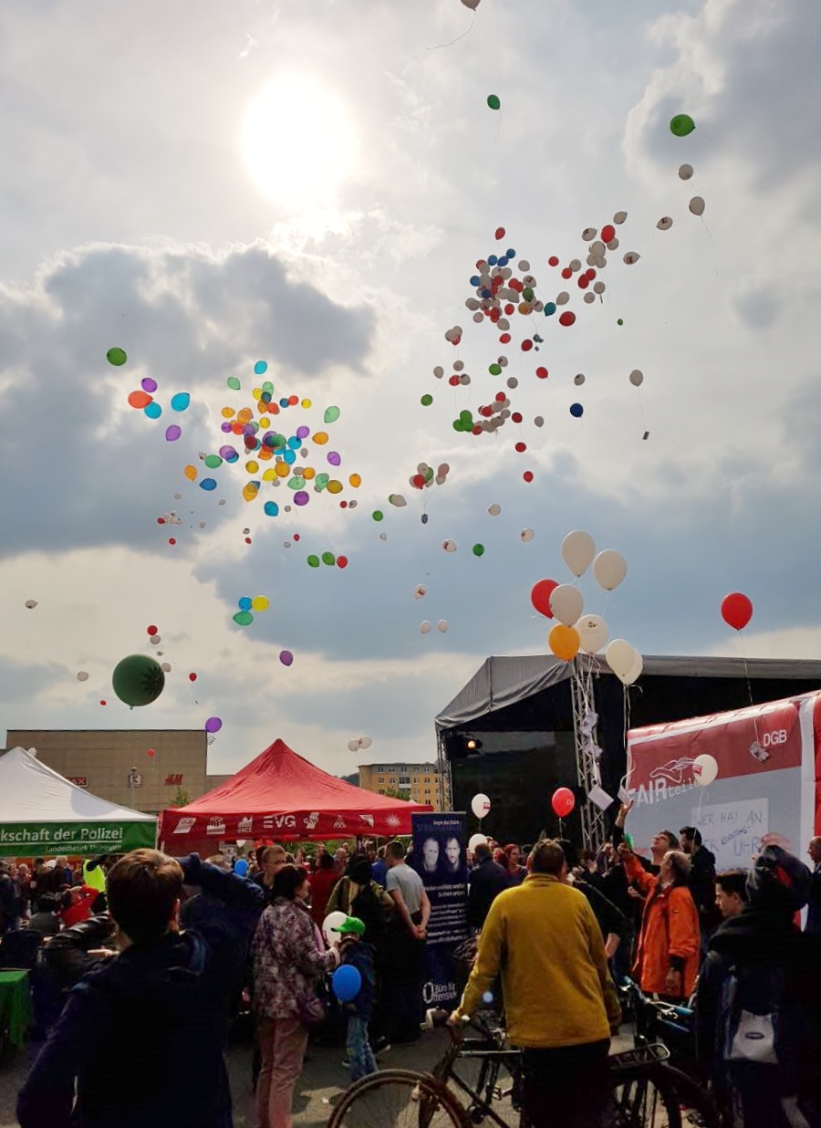 In unserer Mitmachaktion waren die Besucher aufgefordert ihre Wünsche für ein demokratisches Miteinander in Gera auf eine Postkarte zu notieren und an einen Ballon zu knoten. So konnten über 100 Wünsche gesammelt werden. Gemeinsam mit den Ballons der anderen Infostände vorm KuK, stiegen dann ungefähr 500 Ballons in den Geraer Nachmittagshimmel auf. Mit dieser Aktion will die Partnerschaft für Demokratie in Gera Bürgerinnen und Bürger für ein demokratisches Miteinander in Gera werben und sensibilisieren.